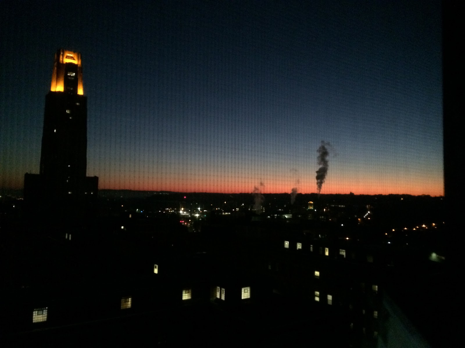 When I moved back to Pittsburgh from New York in 2016, I lived in the University of Pittburgh’s Tower B dormitory. I had a view of the Cathedral of Learning and the Bellefield boiler plant beyond it from my window, and after sleepless nights I’d watch the winter sun rise and silhouette the plant’s billowing steam against an orange smear of sky.